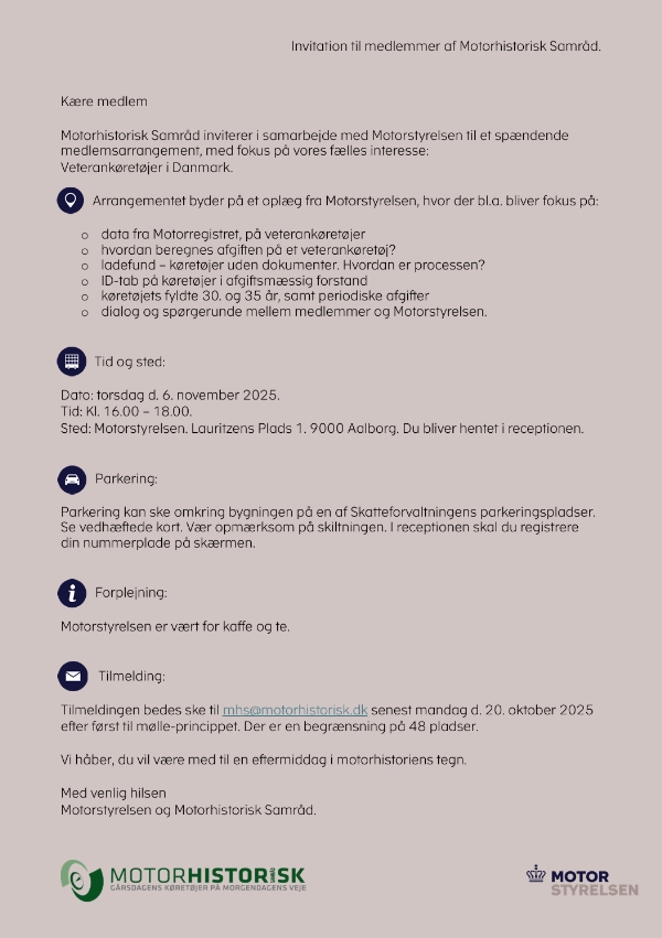 I samarbejde med styrelsen har vi sat en eftermiddag af på Motorstyrelsens hovedkontor i Aalborg. Se invitationen her under for yderligere detaljer, og del gerne med resten af klubben - Alle øvrige vil først blive inviteret omkring 1. oktober, da klubberne og medlemmer skal have forrang.